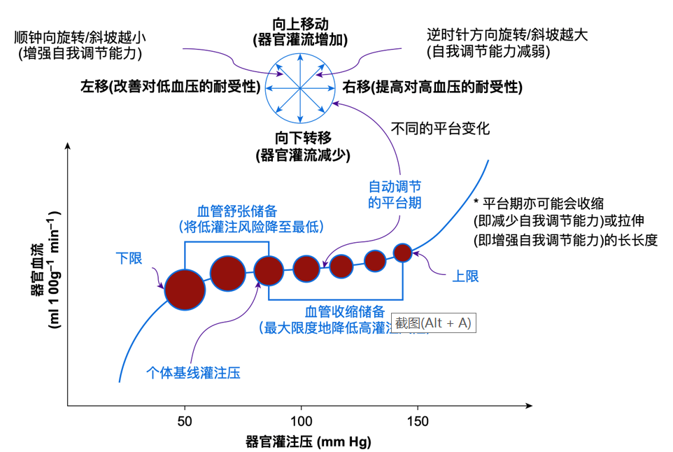 压力自动调节,尽管会造成灌注压力波动,但仍能保持相对稳定的器官灌注,这只是器官血流调节的一种机制(Fig.4)。在非压力调节机制(例如化学调节)的背景下看待压力自动调节可能会令人困惑。有两种方法可以考虑压力自动调节和非压力调节机制之间的相互作用。一种方式是将它们视为共存或平行的机制,器官灌注是它们相加的最终结果。另一种方式是将非压力调节机制视为调节压力自动调节的因素;例如,高碳酸血症(即一种代谢物)可缩短压力自动调节的平台期并将其抬高。除了与非压力调节机制的相互作用,压力自动调节还受到生理因素(如年龄)、慢性疾病(如高血压和动脉硬化)、急性疾病(如脑外伤)、麻醉剂(如七氟烷)和药物(如钙通道阻断剂)的影响。此外,不同的器官有不同的压力自动调节能力,而通常被认为是重要的器官(大脑、心脏和肾脏)都配备了强大的自动调节能力。压力自动调节功能使哺乳动物,特别是它们的重要器官对急性低血压和高血压的耐受力更强。在低血压期间,压力自动调节提供的稳定的器官灌注与Fig. 2b中描述的情况一致(灌注压力和RVR的降低相当)。
