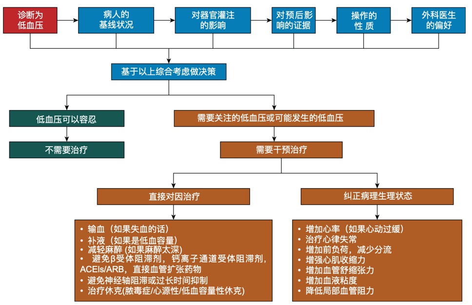 低血压有不同的病理生理机制,对器官灌注和急重症病人的影响也不同。低血压并不总是导致器官灌注不足;事实上,它可能不影响甚至可能增加器官灌注,这取决于灌注压力和RVR以及压力自动调节之间的相对变化。在解释现有的结果证据时,应认识到它们的各自偏见和局限性。总体而言,RCT证据并不支持较高的血压目标总是导致改善预后的观点。低血压的管理可遵循诊断-决策-干预的流程图,在不同的临床情况下对不同的病人群体使用一个阈值来定义低血压是很难的。在处理低血压时,必须考虑血压对器官的灌注效果,而不是专注于一个固定的血压值。治疗或不治疗低血压是一个复杂的决策过程,需要考虑到病人的基线状况、对器官灌注的影响、预后证据和手术的性质。治疗遵循两种方法:治疗直接原因或纠正导致低血压的潜在血流动力学变化。这两种方法有时可能会重叠在一起。因此,重点是血压的基本病理生理学的异质性,对器官灌注的影响和病人的预后。