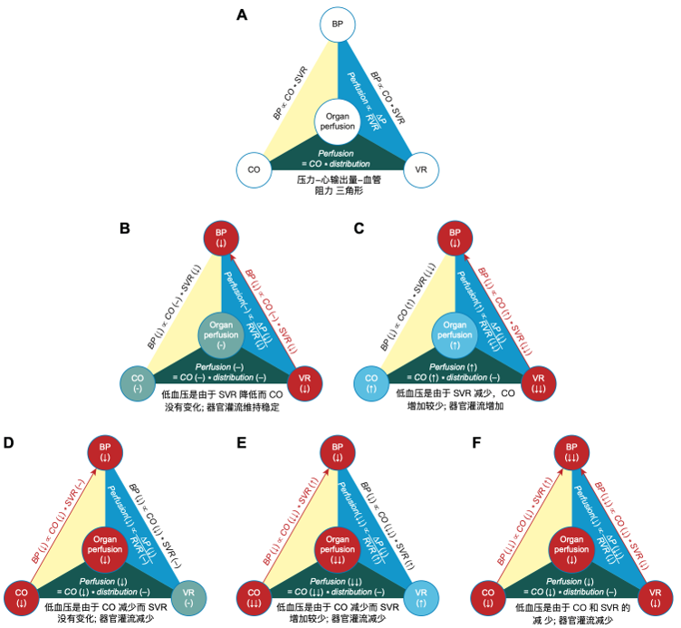 Fig.2.压力-心输出量-血管阻力三角形。器官灌注位于三角形的中心。这张图是基于以下前提。(1)全身血管阻力(血压的决定因素)和区域血管阻力(器官灌注的决定因素)的变化是一致的,以及(2)心输出量在各器官中的份额保持稳定。血压与心输出量和全身血管阻力成正比。器官灌注与灌注压成正比,与区域血管阻力成反比;它占心输出量的一个百分比份额(a)。低血压可由全身血管阻力下降引起(接近红圈和红色箭头),在这种情况下,器官灌注保持稳定,因为血压和区域血管阻力的比例下降(b)。低血压可由全身血管阻力的显著下降引起(闭合的红圈和红色箭头),尽管心输出量有较小程度的增加(闭合的蓝圈)。在这种情况下,由于血压的降低比区域血管阻力的降低要小,所以器官灌注量增加(c)。低血压可由心输出量减少引起(封闭的红圈和红色箭头),在这种情况下,器官灌注量减少,因为在区域血管阻力不变的情况下,灌注压力下降(d)。低血压可由心输出量的明显减少引起(封闭的红圈和红色箭头),尽管全身血管阻力的增加程度较小(封闭的蓝圈)。在这种情况下,由于在区域血管阻力增加的情况下灌注压力下降,器官灌注明显减少(e)。低血压可由心输出量和全身血管阻力的同时下降引起(封闭的红圈和红色箭头)。在这种情况下,由于灌注压的下降比区域血管阻力的下降更明显,所以器官灌注减少(f)。CO,心输出量;VR,血管阻力,根据情况可以是SVR(全身血管阻力)或RVR(区域血管阻力);𝚫P,灌注压。