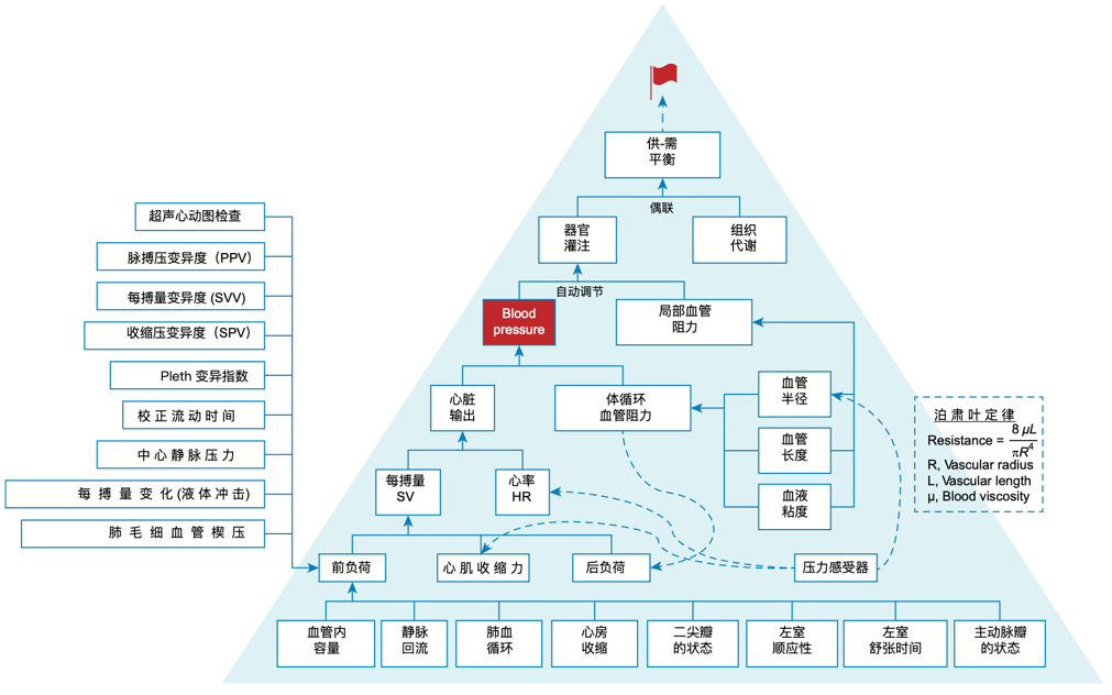 Fig.1.血流动力学金字塔。静脉血必须返回心脏,流经右心、肺血管、左心房和二尖瓣,以形成左心室的前负荷。左心室前负荷的大小还取决于心房收缩、二尖瓣状态、主动脉瓣状态(如主动脉瓣反流导致前负荷增加)以及左心室的顺应性和舒张时间。每搏量的大小取决于前负荷、心肌收缩力和后负荷。血压取决于心输出量和全身血管阻力(SVR),而心输出量是每搏量和心率的乘积。后负荷和SVR是相关的。SVR与血管长度和血液粘度成正比,与血管半径的四次方成反比,这种关系可以用Hagen-Poiseuille方程表示。器官灌注取决于血压(或灌注压)和区域血管阻力(RVR)。器官灌注压力和RVR之间的关系受压力自动调节的制约。器官灌注和组织代谢活动之间的匹配决定了灌注的充分性,是器官状态良好的前提之一。充分的器官灌注是血流动力学管理的首要目标。压力反射(Baroreflex)主要对血管半径、心率和心肌收缩力产生影响。血压(红色字体突出)和心率在重症监护中总是被监测。现代血流动力学监测仪可以评估每搏量,从而评估心输出量或指数。基于近红外光谱的组织血氧仪可以评估组织耗氧和供氧之间的平衡。各种各样的手段和参数可以评估前负荷。现代血流动力学管理有多种方法,其有效性可能不同,取决于所关注的预后。LV,左心室。