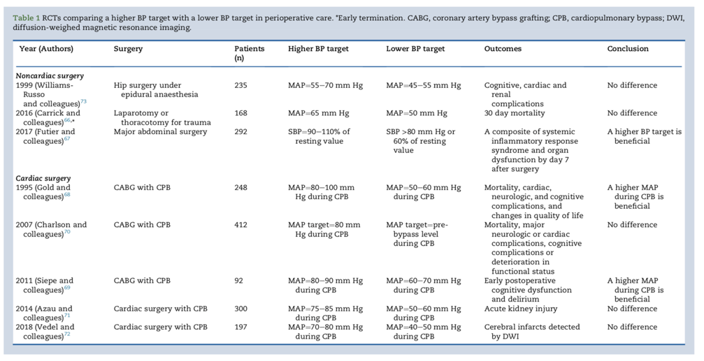 表1. 在围手术期监护中比较较高血压目标和较低血压目标的RCTs。*早期终止。CABG,冠状动脉旁路移植;CPB,心肺转流;DWI,弥散加权磁共振成像。