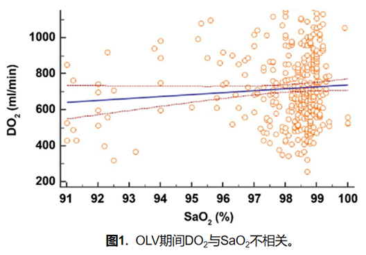 以前的研究发现,当DO2/VO2的比例低于2:1时,会发生这种转变。重要的是,我们知道临界氧运输阈值小于8 mlO2/kg/min,可能低至3 mlO2/kg/min。其他人认为500 ml/min足以避免全身麻醉下组织缺氧。在该比值的消耗方面,先前已经表明,胸部手术期间的VO2约为130 ml/min。由于我们可以粗略的计算任何给定患者的氧气输送量,这就提供了获得安全输送与消耗比率并提升个性化患者管理的机会。先前的一项研究评估了单肺通气期间计算的氧气输送,发现14%的患者输送低于500ml/min的阈值。有趣的是,这些患者的氧输送与外周血氧饱和度无关(图1),进一步强调了心输出量的重要作用。这种策略的局限性与微创心输出量监护仪的假设以及在动态、高节奏的胸科手术室所需的耗时相关,在这种手术室中,整体评估可能无法反映区域差异。