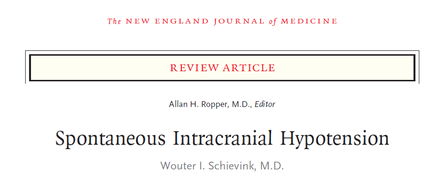 本期NEJM发表的一篇自发性颅内低压(Spontaneous Intracranial Hypotension)综述,也可称为自发性脑脊液漏(CSF leakage),或者说不明原因性头痛。它一直是困扰脑外科,骨科,疼痛科的一大课题。邵逸夫医院麻醉科的何非方主任,就专门研究脑脊液漏,还是三四年前听过他的课,说邵逸夫医院是全国最大的专门治疗脑脊液漏机构,已经治愈病人达数百例。由于此病与硬膜外穿刺后头痛(post pural puncture headache)症状比较相似,也是麻醉临床中常常碰到的问题,一起学习。