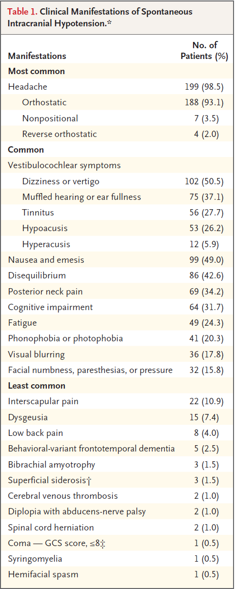自发性的概念当然是无明显因素引起的,在排除颅脑创伤、肿瘤,脊柱外科手术,或椎管内麻醉穿刺导致的急性或慢性的脑脊液渗漏之外的。颅内压可能为正常 6 至25 cmH2O, or 4.4 至18.4 mmhg),但是仍低于患者基础值。临床表现包括头晕目眩,精神迟钝,行为改变等,但上述症状均为非典型性,很难与其他疾病鉴别。发病率在4-5每10万人,35-55岁女性患者常见。