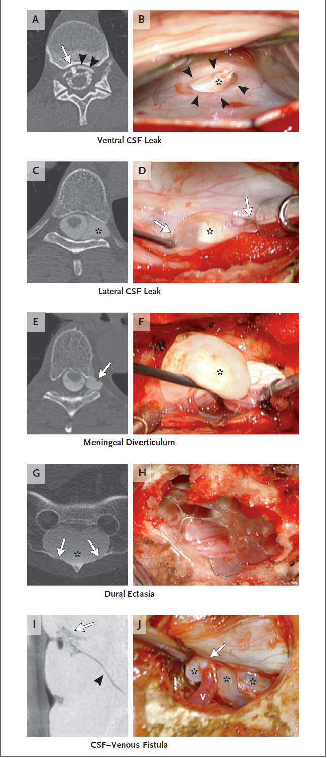 由脊髓磁共振成像与术中观察发现三种类型自发性脊髓脑脊液渗漏。一、位于脊髓腹侧或后外侧硬脑膜线性撕裂所致。第二种类型与单纯性脑脊髓膜憩室(Tarlov囊肿)部位的渗漏或硬脑膜囊的弥漫性扩张(硬脑膜扩张)有关,例如发生在强直性脊柱炎中。第三种类型,被认为是脊髓-脑脊液-静脉瘘。脊髓脑脊液-静脉瘘由含有脊髓蛛网膜下腔的脑脊液与相邻静脉之间的异常交通组成,通常与脑膜憩室有关。