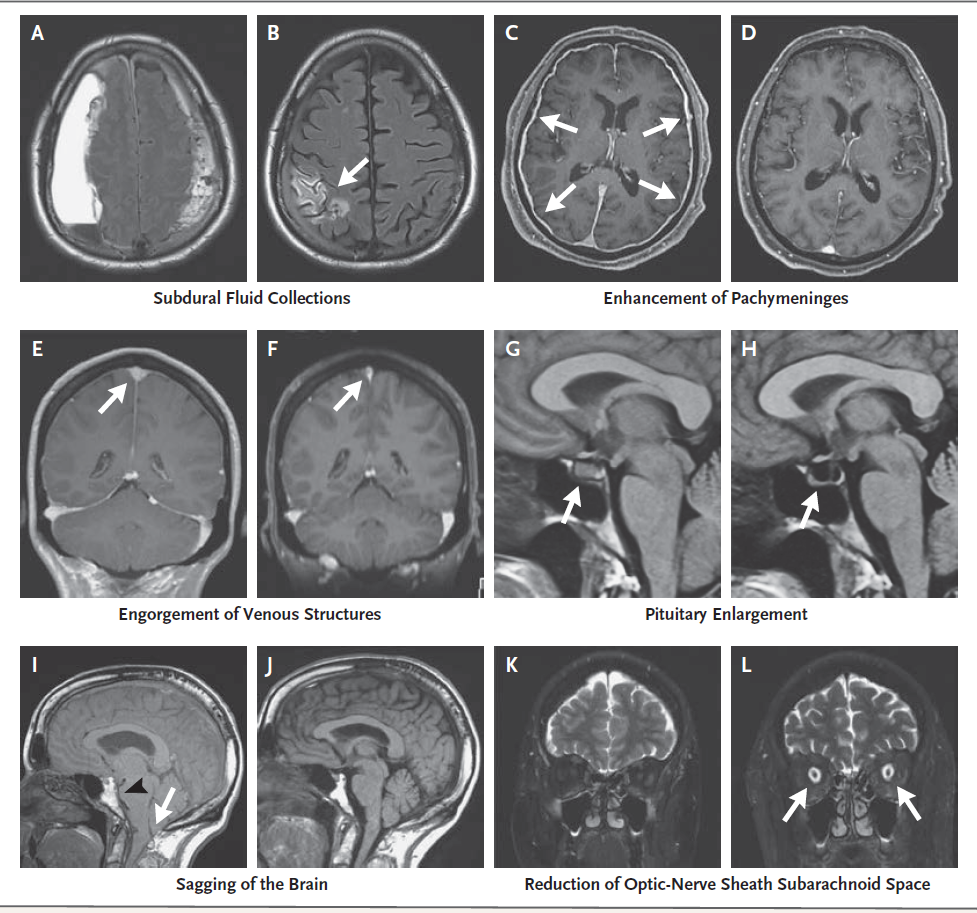 自发性颅内低压的诊断标准包括MRI增强的典型表现、脊柱成像的脑脊液漏或腰椎穿刺测量的脑脊液低压。增强MRI显示硬脑膜增厚,以及硬膜下积液、静脉结构充血、垂体增大、大脑下垂或视神经鞘蛛网膜下腔体积减小的特征厚脑膜强化其原因可能与颅内空间内脑脊液体积降低导致的颅硬脑膜静脉系统继发性扩张有关(Monro–Kellie学说)。但20%的自发性颅内低血压患者头部MRI表现正常