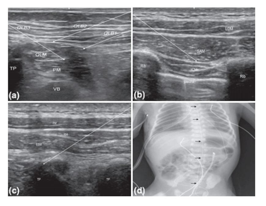 图2 (a)一例15个月大儿童腰方肌阻滞的超声解剖。箭头表示1型、2型和3型腰方肌的针尖位置 (b)16岁儿童前锯肌平面阻滞的超声解剖。箭头表示深锯齿前平面阻滞的针尖位置 (c)竖脊肌阻滞的超声解剖。箭头表示竖脊肌的针尖位置 (d)从尾部空间穿过不透射线的胸段硬膜外螺纹。