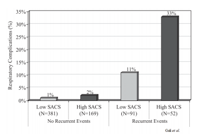 呼吸特异性事件与随后的呼吸系统并发症密切相关。Gali等研究了住院手术时间超过48小时的住院患者,根据术前阻塞性睡眠呼吸暂停评分和麻醉后监测治疗室事件复发(如呼吸暂停,呼吸急促,氧合血红蛋白去饱和和疼痛镇静不匹配)。在麻醉后监测治疗室中具有高阻塞性睡眠呼吸暂停评分和复发事件的患者的呼吸系统并发症发生率为33%,而具有复发性呼吸特异性事件但阻塞性睡眠呼吸暂停评分低的患者的并发症发生率低3倍。相比之下,麻醉后监测治疗室中未出现复发事件的患者呼吸系统并发症发生率为≤2%,无论是否有阻塞性睡眠呼吸暂停检测(图3)。