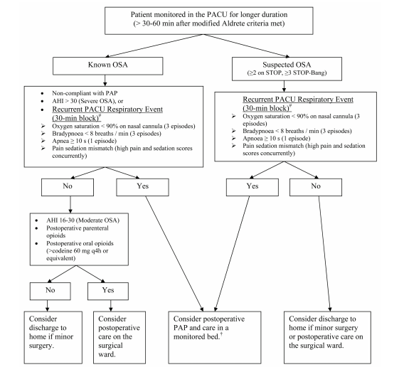 图 2. 全身麻醉后确诊或疑似阻塞性睡眠呼吸暂停患者的术后管理。经Seet和Chung许可改编图2图例:# 麻醉后监测治疗室复发性呼吸事件——在每 30 分钟评估期内发生超过一次的任何事件(不一定是同一事件)。†气道正压治疗包括连续气道正压、双水平气道正压或自动滴定气道正压,监测床是具有连续血氧饱和度和可能的早期护理干预的设置(例如,重症监护病房、降压病房、或在外科病房使用遥测远程脉搏血氧仪)。疼痛-镇静不匹配=同时出现高疼痛评分和过度镇静的事件。