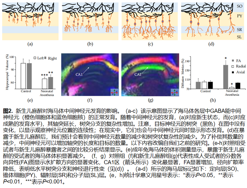 在新生儿麻醉后观察到的学习和行为缺陷中,涉及这些功能的大脑区域是研究最多的。例如,海马体和海马体相关结构一直是研究新生儿麻醉的病理效应的热点。新生儿麻醉暴露已被证明可导致显著的神经细胞凋亡和海马体树突状复杂性的降低(图2d)。Maloney等人观察到每2天,持续6h的共3次麻醉后小鼠海马体神经凋亡。Jiang等人在出生后第7、14和21天的3个时间点进行了6h的麻醉,与对照组相比观察到细胞凋亡,大鼠海马体积显著减少。同样,在新生兔暴露于三次麻醉后在成年海马体中也观察到了体积的减少(图2e)。该研究还进行了弥散张量成像,并发现了CA1区域的分数各向异性的显著变化(图2f-h),表明细胞和树突状分支的减少。麻醉的神经毒性作用可不同程度地诱导海马细胞的凋亡。GABA能神经元占凋亡细胞的比例几乎是谷氨酸能神经元的四倍。