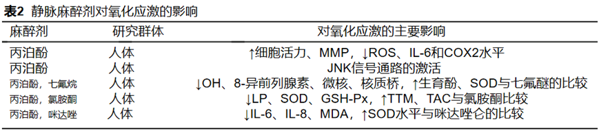 表2总结了本文所讨论的静脉麻醉剂对氧化应激的影响。