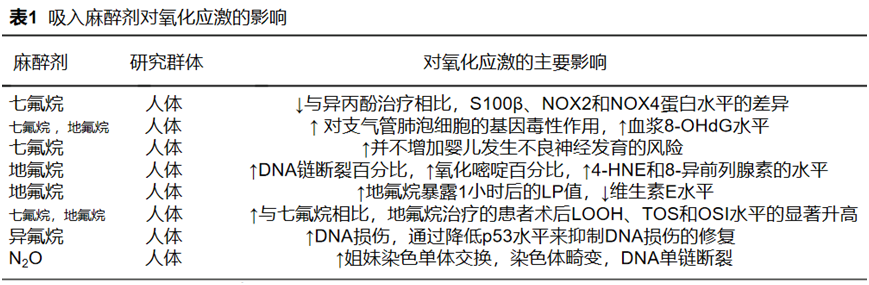 表1总结了本文所讨论的吸入性麻醉剂对氧化应激的影响。