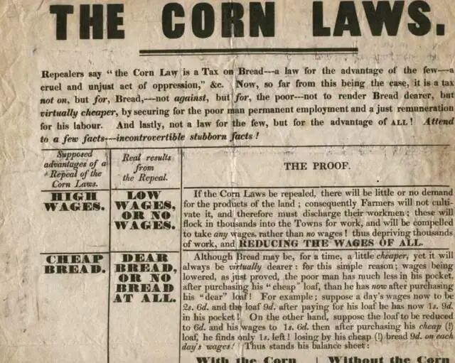 小贴士:《谷物法》目的是让英国农夫及地主,免受来自从生产成本较低廉的外国所进口的谷物的竞争,它规定了国产谷物平均价达到或超过某种限度时方可进口,但其目的却是维护土地贵族们的利益。