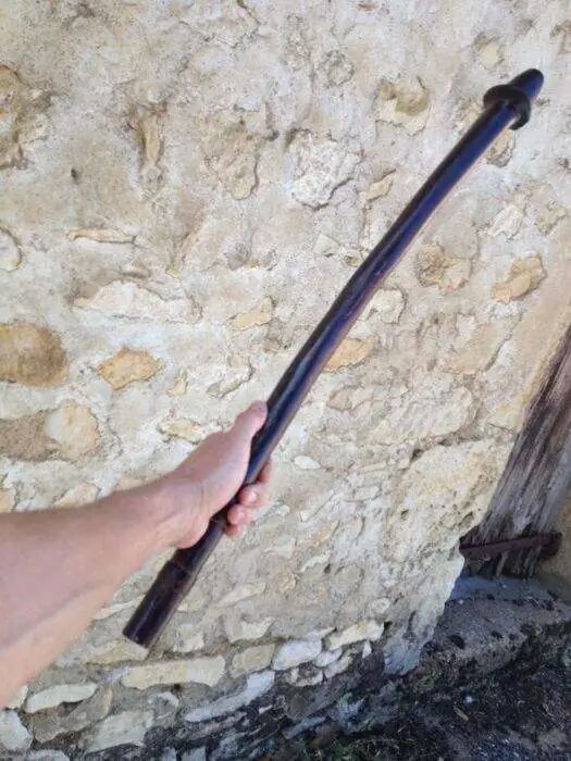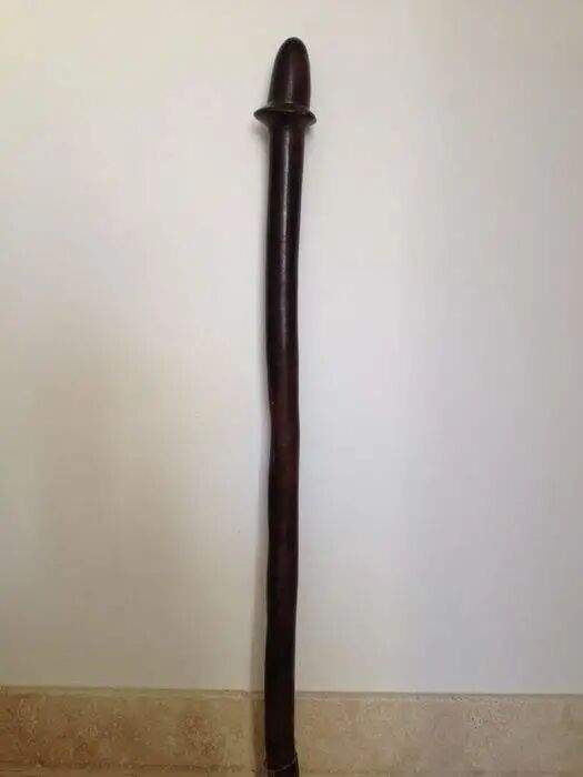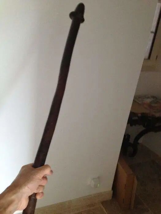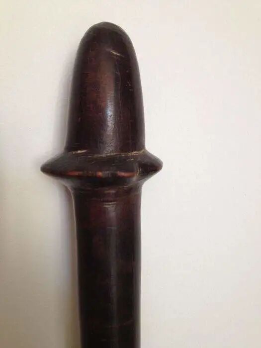 该木棒长约75厘米,重约650克,形状较为平直,平均直径在35 到40毫米之间,其最粗的地方为其“颈部”,直径约为55毫米,就是顶部的那一圈凸起,用于装饰并增加杀伤力。因为木棒本身的材质坚硬致密,使得它较为沉重,可以挥击也可以投掷伤人。