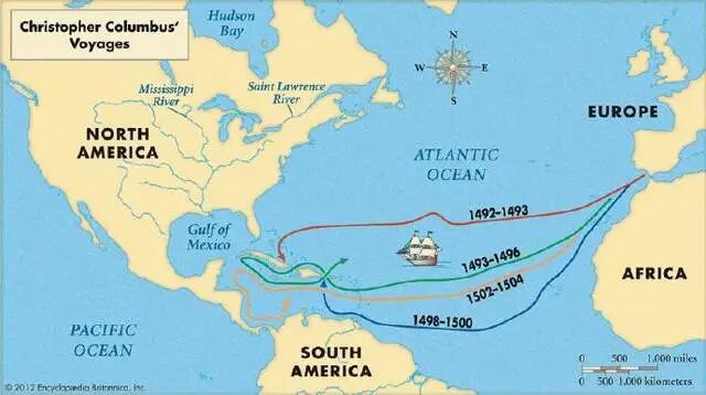 蓝色线条为哥伦布第三次航海探索时的路线,他探寻了帕里亚海岸附近