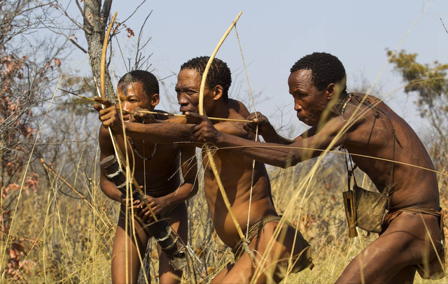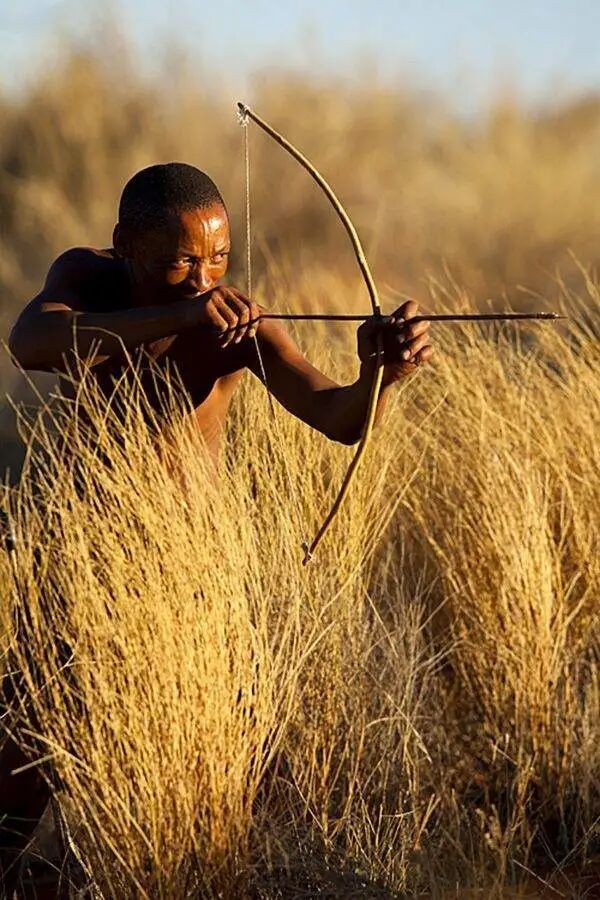 布须曼人所使用的猎弓,是只有几十厘米长的小短弓(有些也超过了一米),磅数很小,有效射程也很近,不过二三十米,其杀伤力主要是靠涂抹在箭头上的致命毒素(来自某种甲虫的幼虫)。