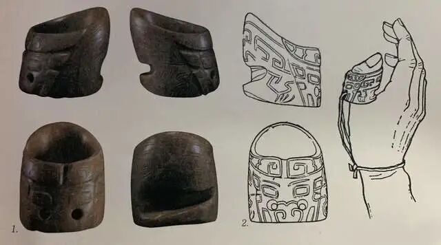 为了保护大拇指,并防止急速回抽的弓弦擦伤手指,弓手必须要带扳指才行。这里需要说明的是,射箭所用的扳指不是大家常见的玉质文玩扳指,而是特殊形制的“武扳指”。