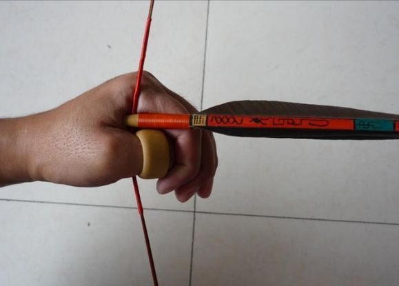 二问:咱们中国古代用什么方法(拉弓射箭)呢?用食指和中指的第一关节夹住吗?