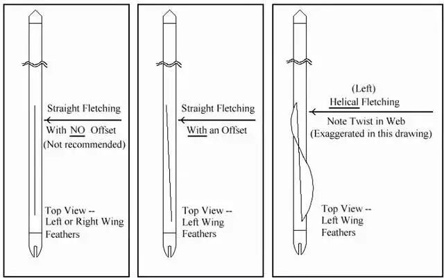 而按照箭羽在箭杆上的粘贴位置和角度来分的话,箭羽又分为“螺旋羽”、“斜羽”和“直羽”三种,这三种粘贴方式的箭羽各有特点。