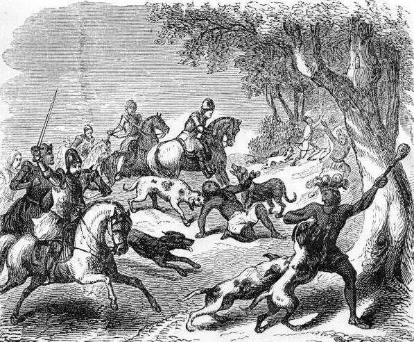 两条腿的人哪能跑得过四条腿的狗,在猎犬的围追堵截之下,一些印第安人被西班牙探险者的长矛穿心而过,有些则被西班牙人用刀剑砍倒在地,而由于当地印第安人缺少铠甲防护,他们面对猎犬的尖牙厉爪时难以相抗,因此还有很多倒霉的印第安人被猎犬直接撕成了碎片,惨不忍睹。