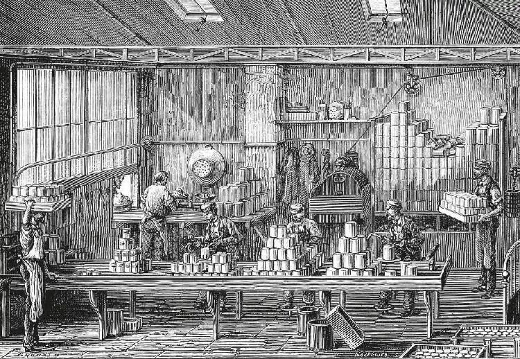首先,最初的马口铁罐头都是手工生产的,产量很低,一个工人一天最多只能生产几十只,在19世纪的最初几年里,即使是一个干活卖力的工人一天也只能生产大约60个罐头,这导致马口铁罐头在很长时间内都没能推广普及,所以人们对与之相匹配的开罐工具需求并不大,发明动力不足。