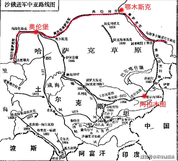 沙俄采用步步推进的方式缓慢地吞噬着哈萨克草原,1715年在额尔齐斯河中游左岸建立亚梅什堡,1716年在鄂木河注入额尔齐斯河处建立鄂木斯克城堡,1718年建立了塞米巴拉金斯克,1720年在靠近中国边界的斋桑泊西北建立了乌斯季卡缅诺哥尔斯克(清朝称为铿格尔图喇),1738年在哈萨克草原西北建立了奥伦堡。
