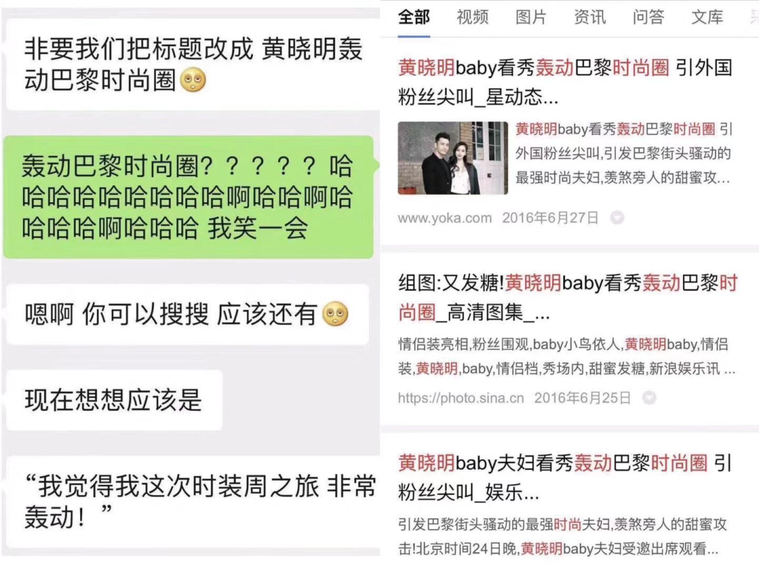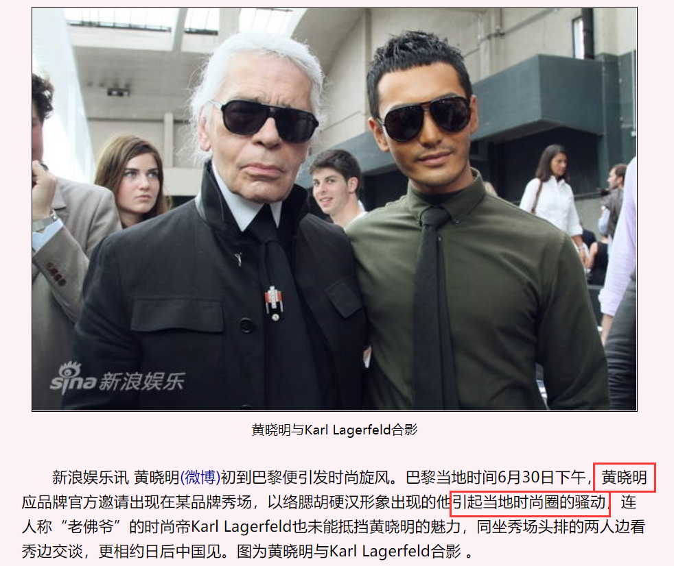 还让时尚编辑把看秀文章的标题改为:黄晓明轰动巴黎时尚圈
