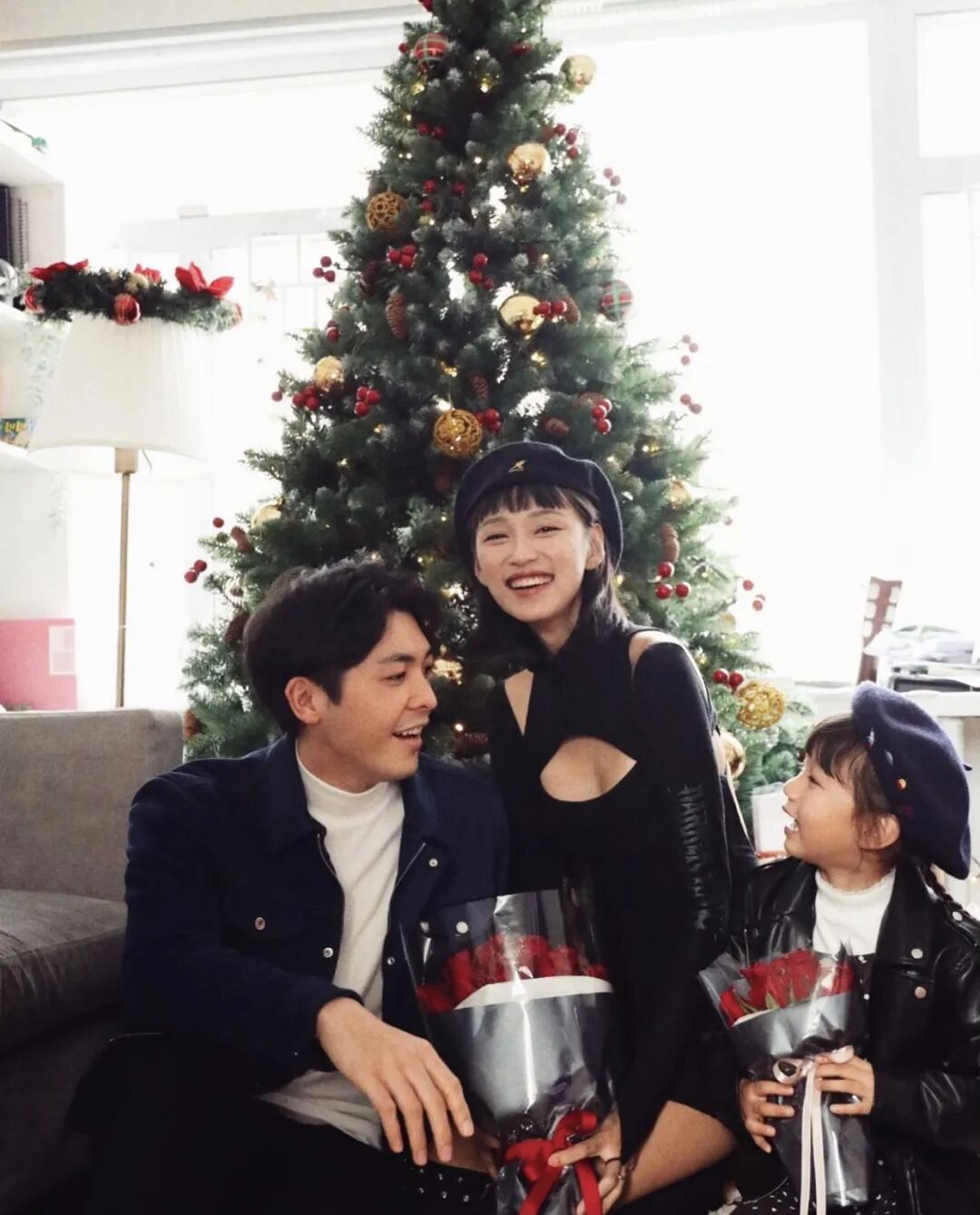 一家三口温馨的彼此依偎在圣诞树下▼