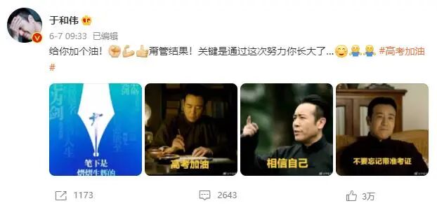 调侃自己可还行,配图也是一绝。就连为高考学子加油,也不忘用上自己的表情包。
