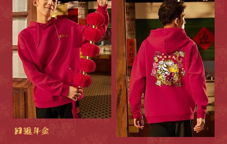 有卫衣也有外套,颜色主打红红火火,设计基本都围绕着“日进斗金”刺绣和“老虎”形象展开。
