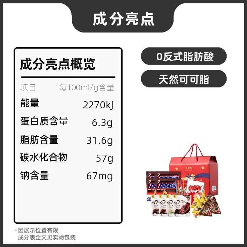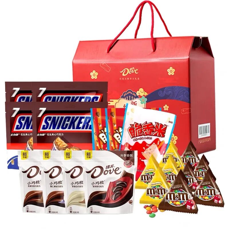 德芙也有尊享大礼包,内含10袋M豆、4袋士力架、3袋脆香米黑巧和4袋德芙小巧粒。