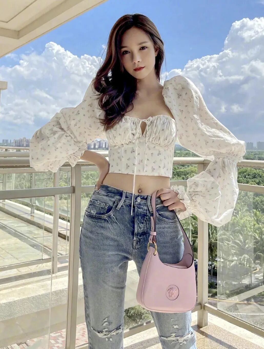 如果穿比较嗲的上衣,她会搭配一条中性的牛仔裤,而不是同样甜美的纱裙。