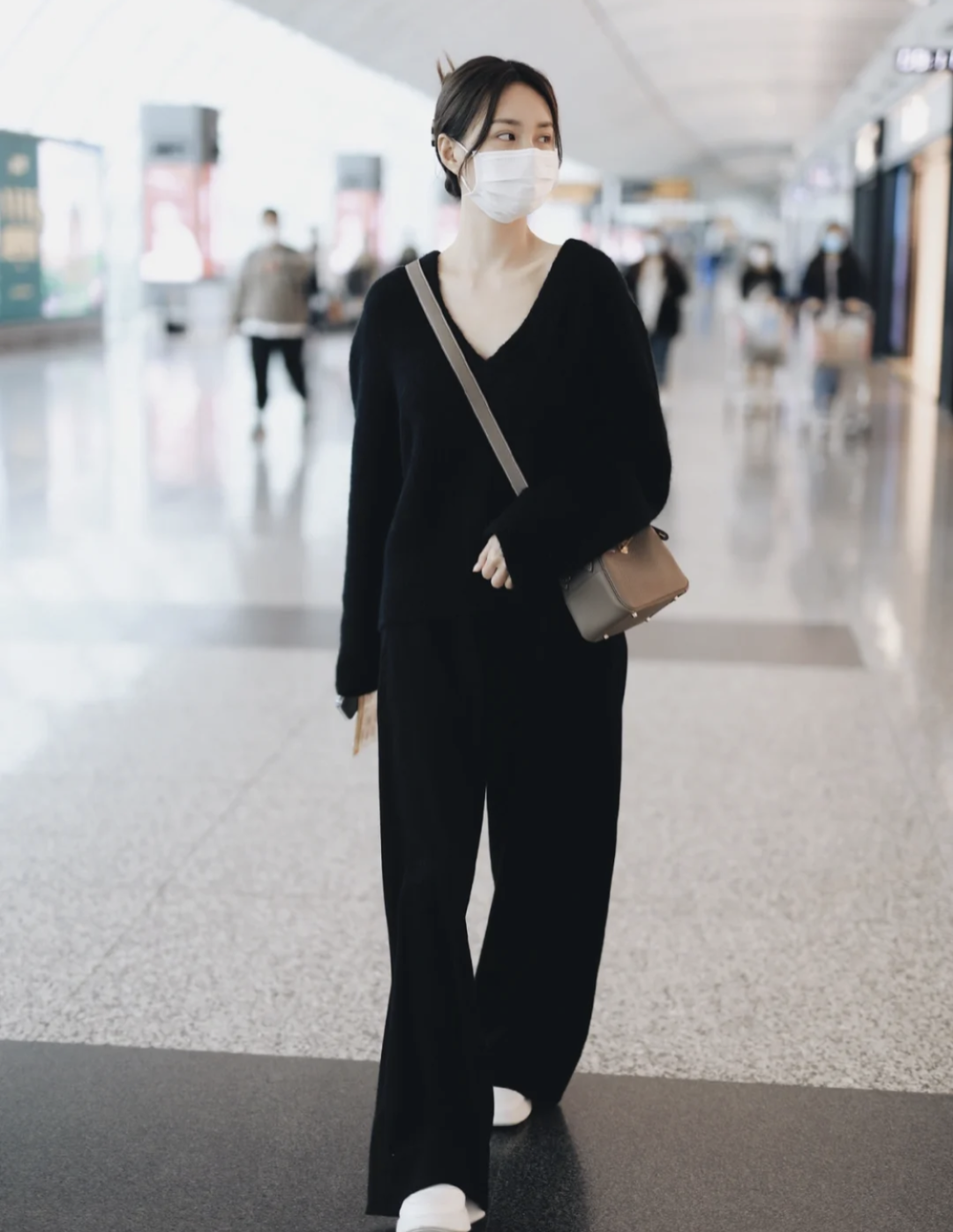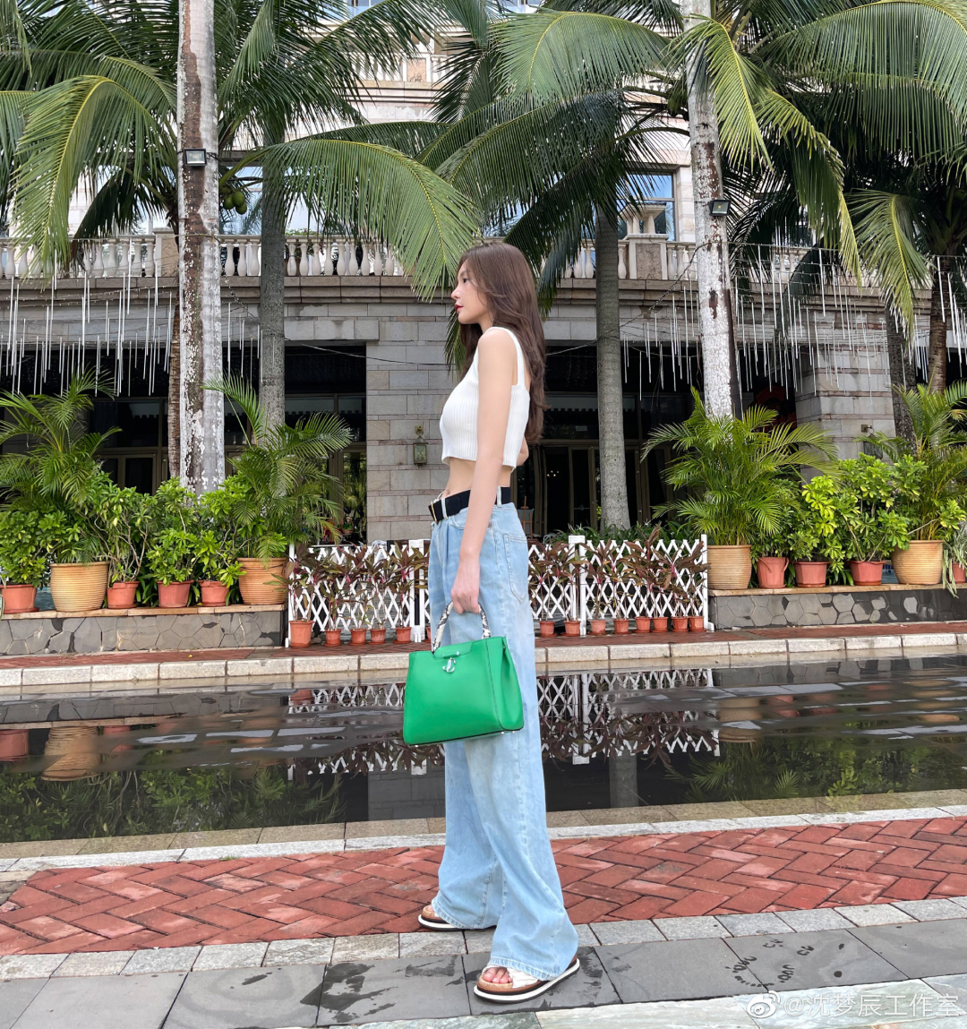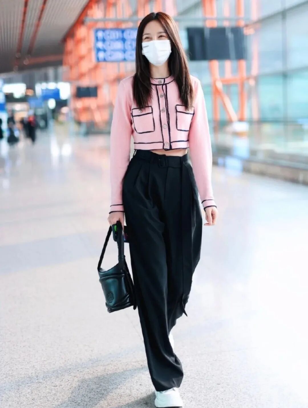 “短紧小上衣+宽松拖地裤”这个穿搭黄金法则,沈梦辰屡试不爽。