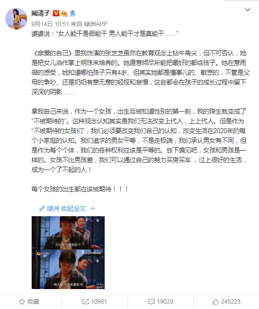 她曾表示“作为一个女孩儿,出生后被知道性别的第一刻,我的降生就变成了‘不被期待的’。”