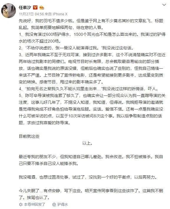 后来《驴得水》火起来以后,有人吹捧她,试图给她营造各种人设,结果她自己亲自下场辟谣,:只要我自己不捧杀自己没人能捧杀我。