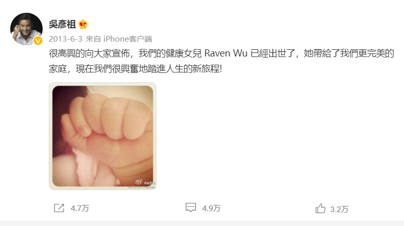 结婚第三年,两人迎来了一个可爱的女儿,取名叫吴斐然(Raven Wu),