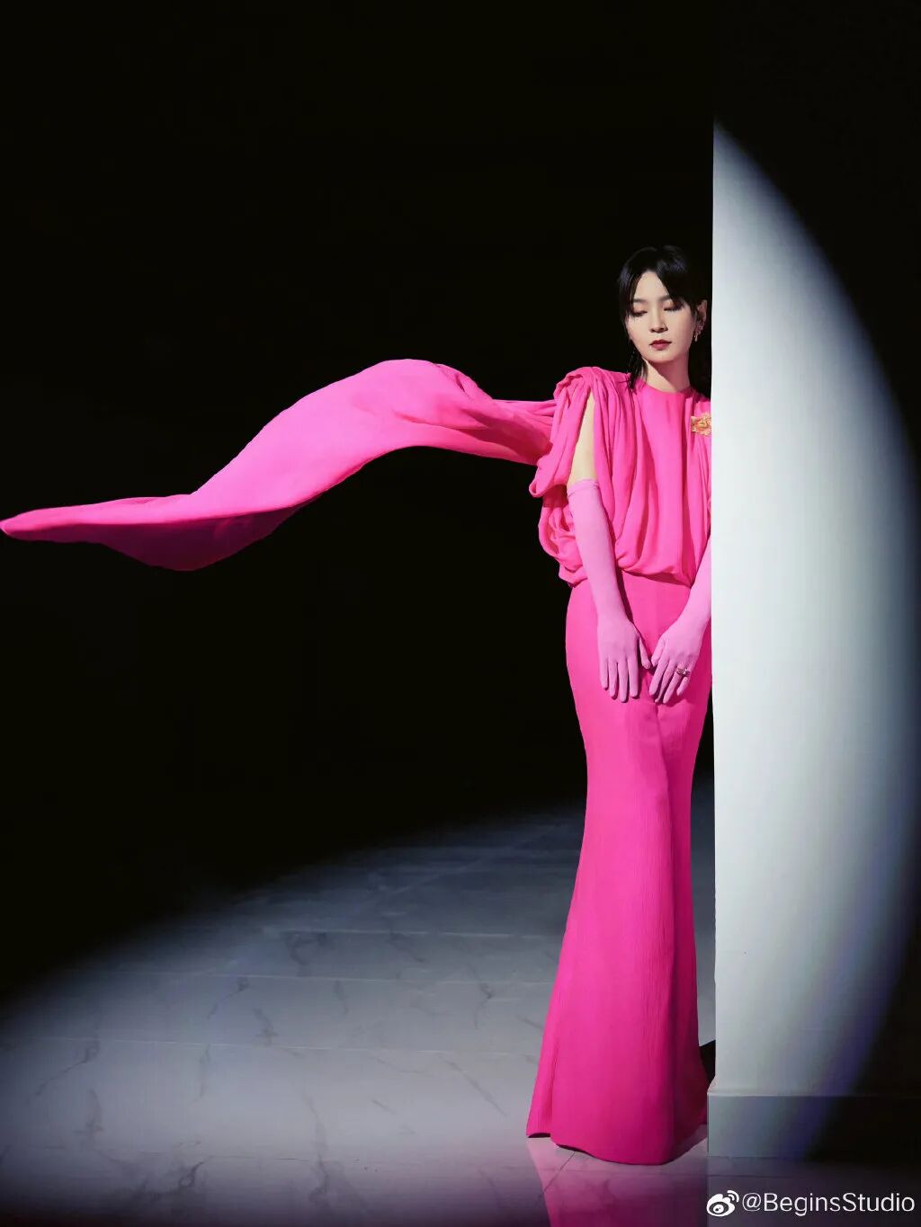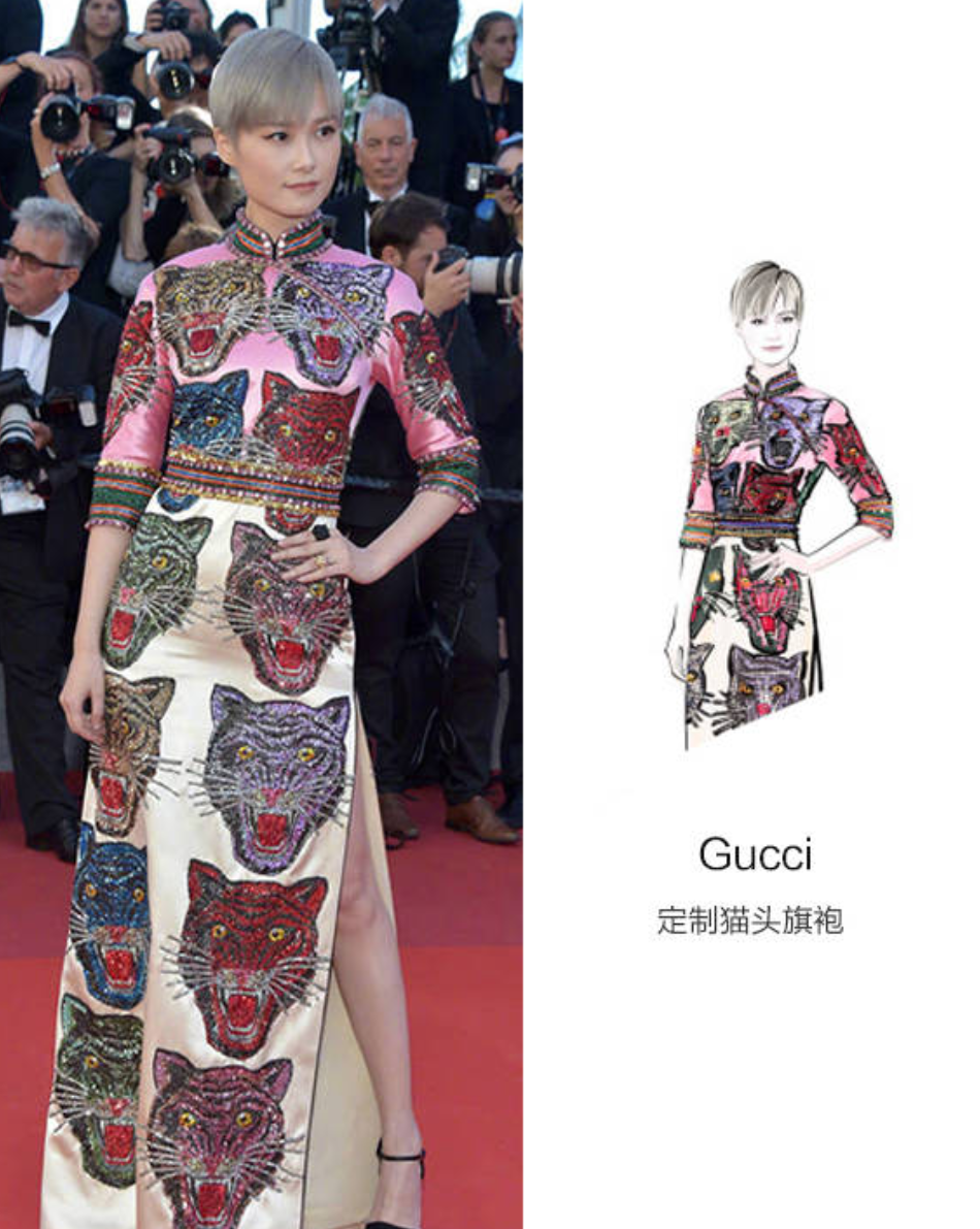 2019年她以一身Gucci定制的孔雀长裙,红色绸缎和黑色天鹅绒拼接,不仅在国际红毯上带来中式华贵的元素,更是将自我身上独特的优雅又洒脱的氛围感体现出来。