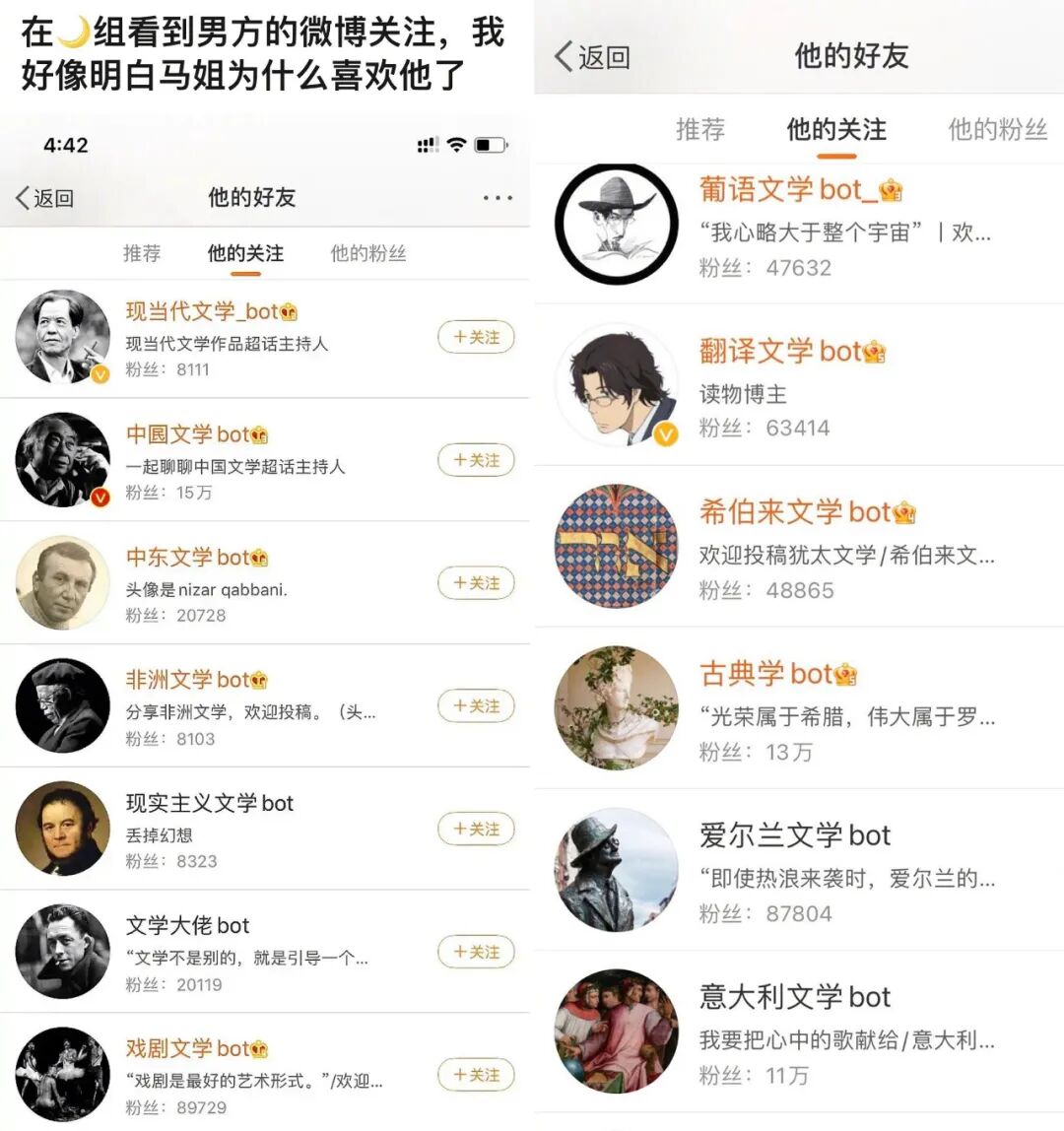 有网友扒出张哲轩的微博关注,满屏的“文学bot”......