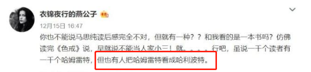 “虽说一千个读者有一千个哈姆雷特,但也有人(指马思纯)把哈姆雷特看成哈利波特。”