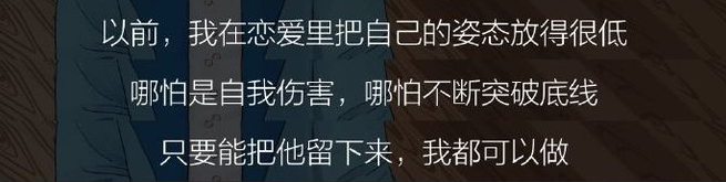 “在恋爱里把自己的姿态放得很低,哪怕是自我伤害,哪怕不断突破底线,只要能把他留下来,我都可以做。”
