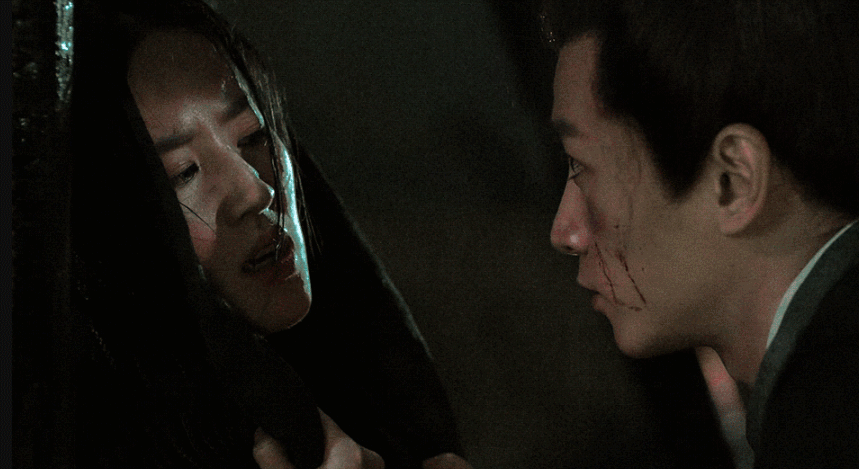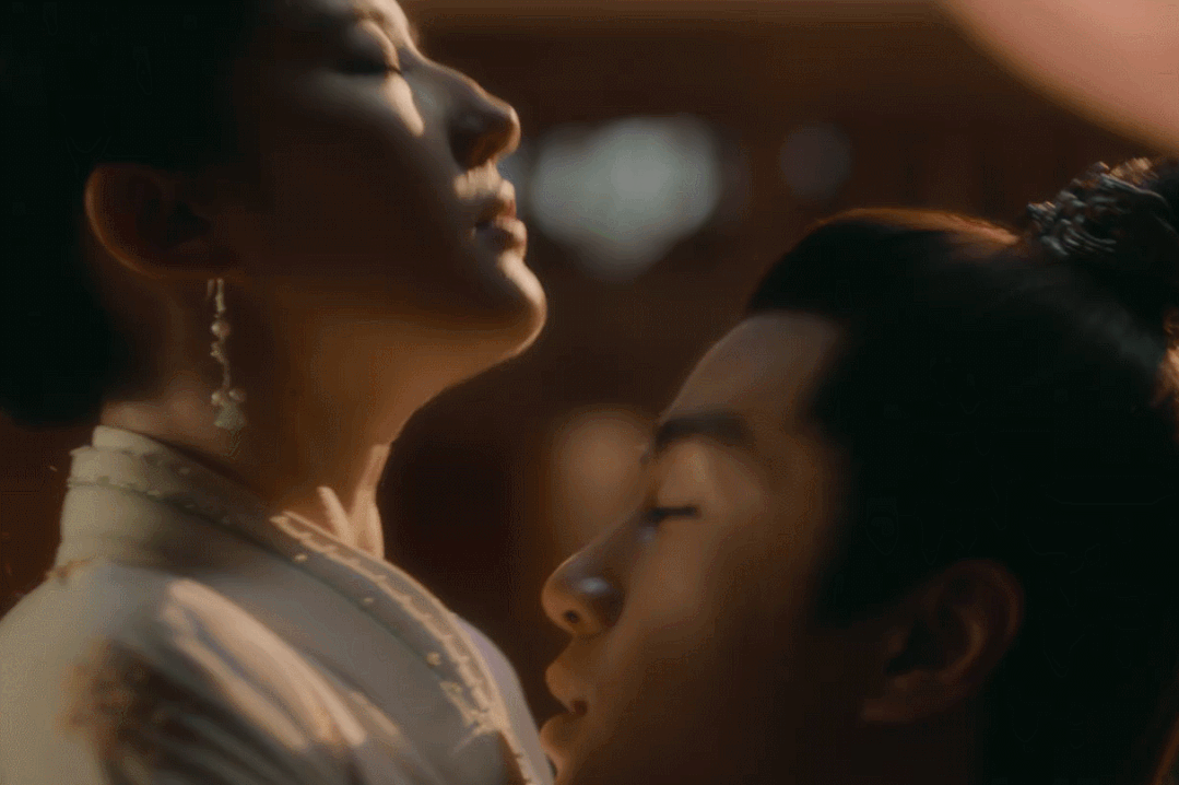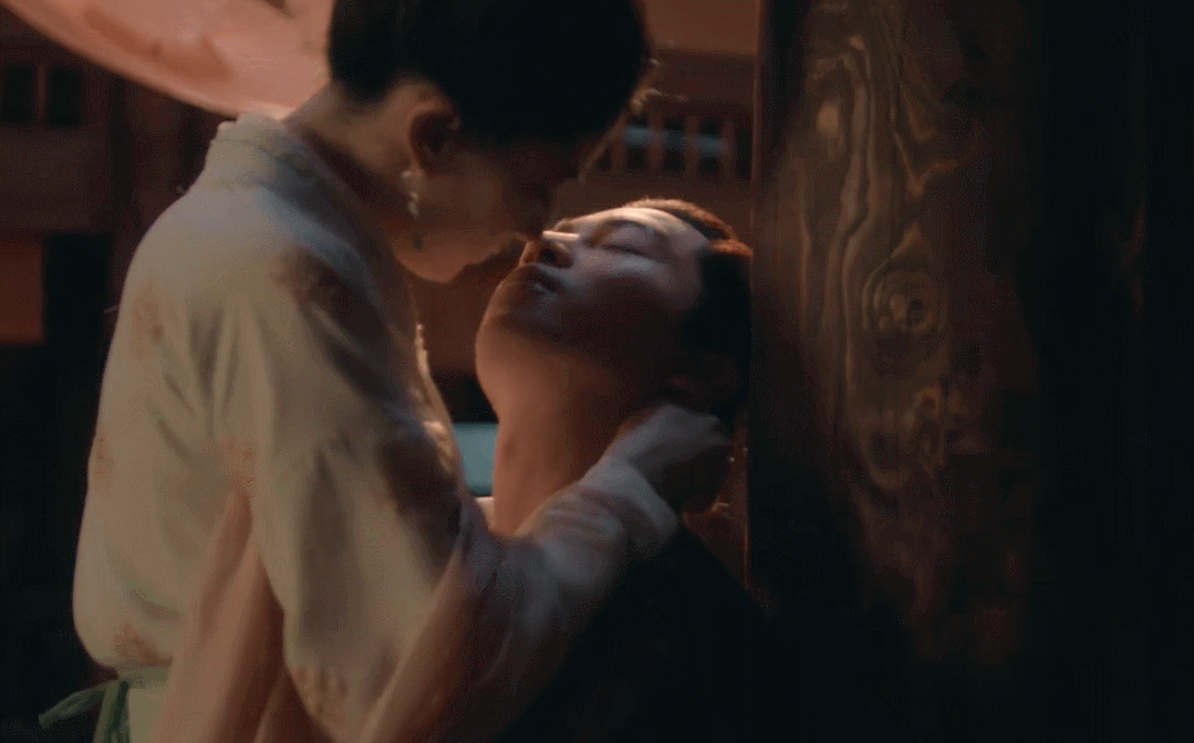 刘亦菲微张的嘴唇,后仰的动作,将性张力拉满。陈晓逐渐向下的吻,增添了色气+欲望感,同时也给足了观众想象空间。