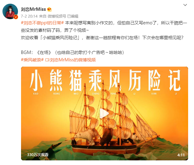 在节目上曾“留下豪言”说自己要大做特做PPT,结果自己的Vlog名字就叫#刘恋不做PPT的日常~