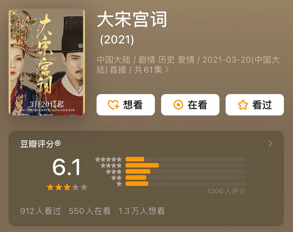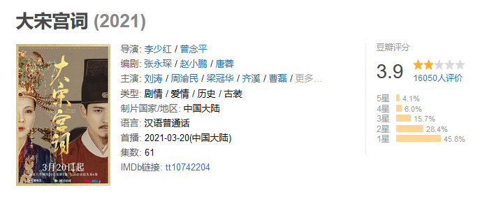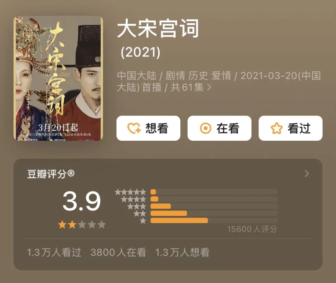 《大宋宫词》现在才播十几集,分数已经降到3.9分,剩下的几十集,不知道还能用什么来扛。