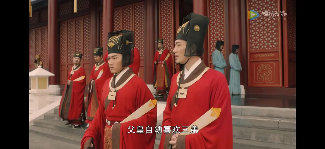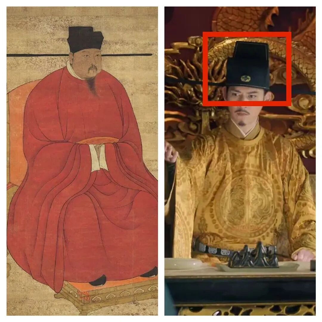 官员的朝服也是一个大bug。学过历史的应该都有印象,宋朝的朝帽是长翅帽,由宋朝开国皇帝赵匡胤所创,防止官员上朝时交头接耳。左:宋朝官员画像;右:《大宋宫词》大臣