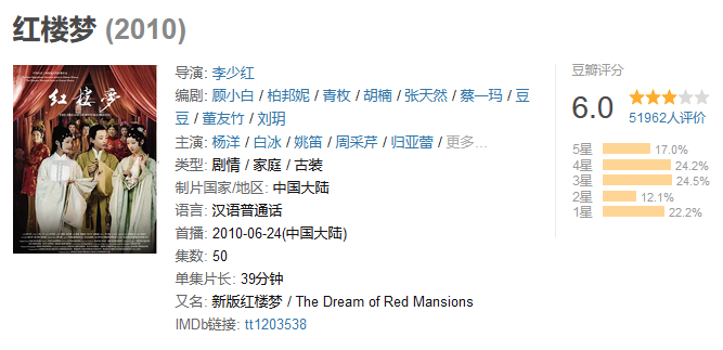 上一次《新红楼梦》,面对豆瓣的6分评价,李少红还能信誓旦旦地说:这剧我就给12分。