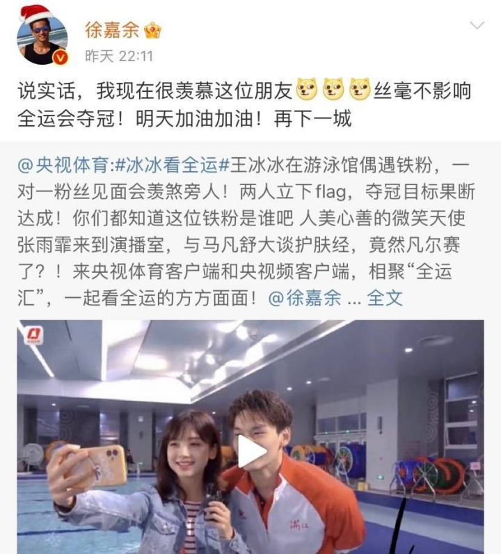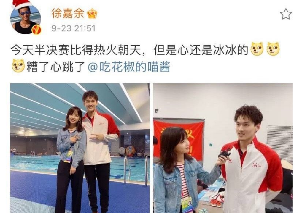 最开始徐嘉余在微博常点赞王冰冰相关动态,早在去年全运会期间两人在一次采访中就互动频繁。