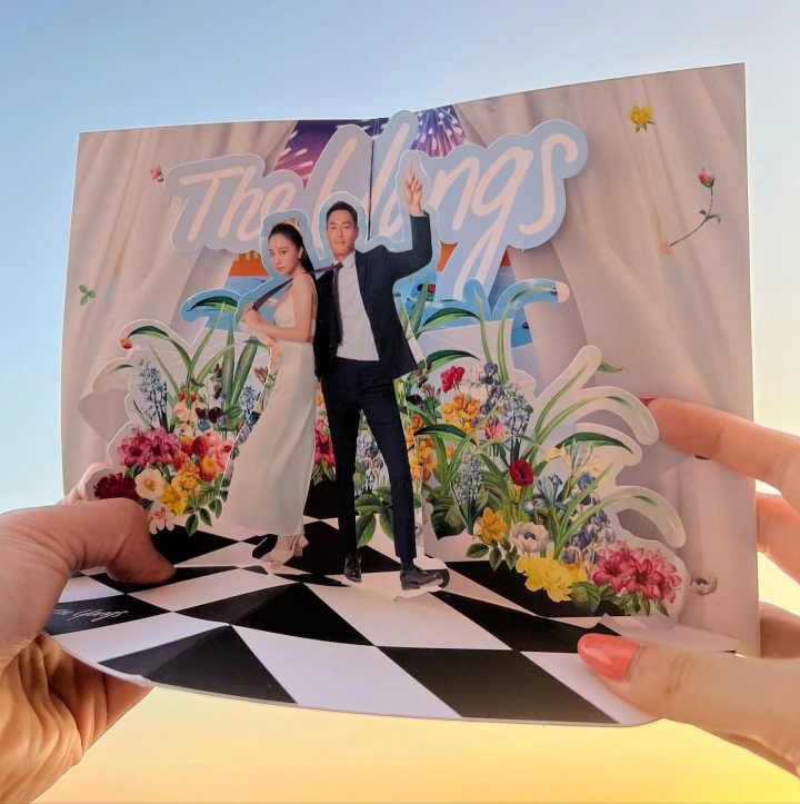 小细节还藏在新娘子设计的请柬里,打开后第一眼就会被大大的“The Yang’s”的主题吸引注意,在彩色的花团中央是一对新人耍宝的2D版。