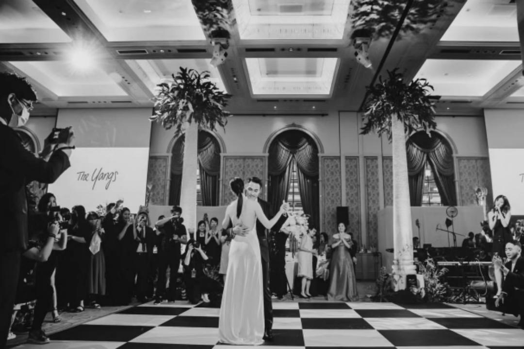 婚礼地点选在当地文华东方酒店,整场婚宴以白色为主色调,适时放上的绿植让一整片白色有了更多层次。