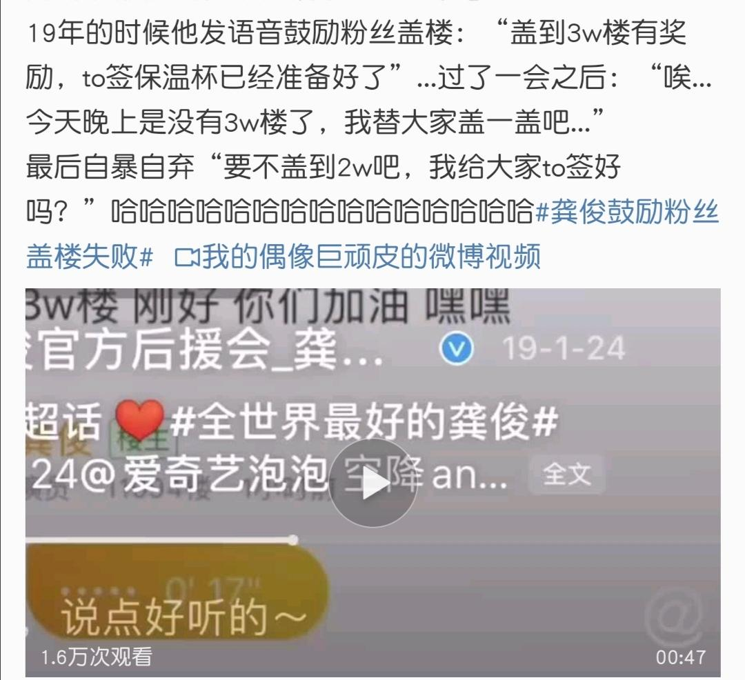 没红时候,龚俊有次直播盖楼赢福利,称盖楼3万就能获得to签保温杯。