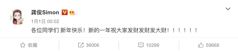 2021年第一天,龚俊就在微博和粉丝们立下了致富的flag——